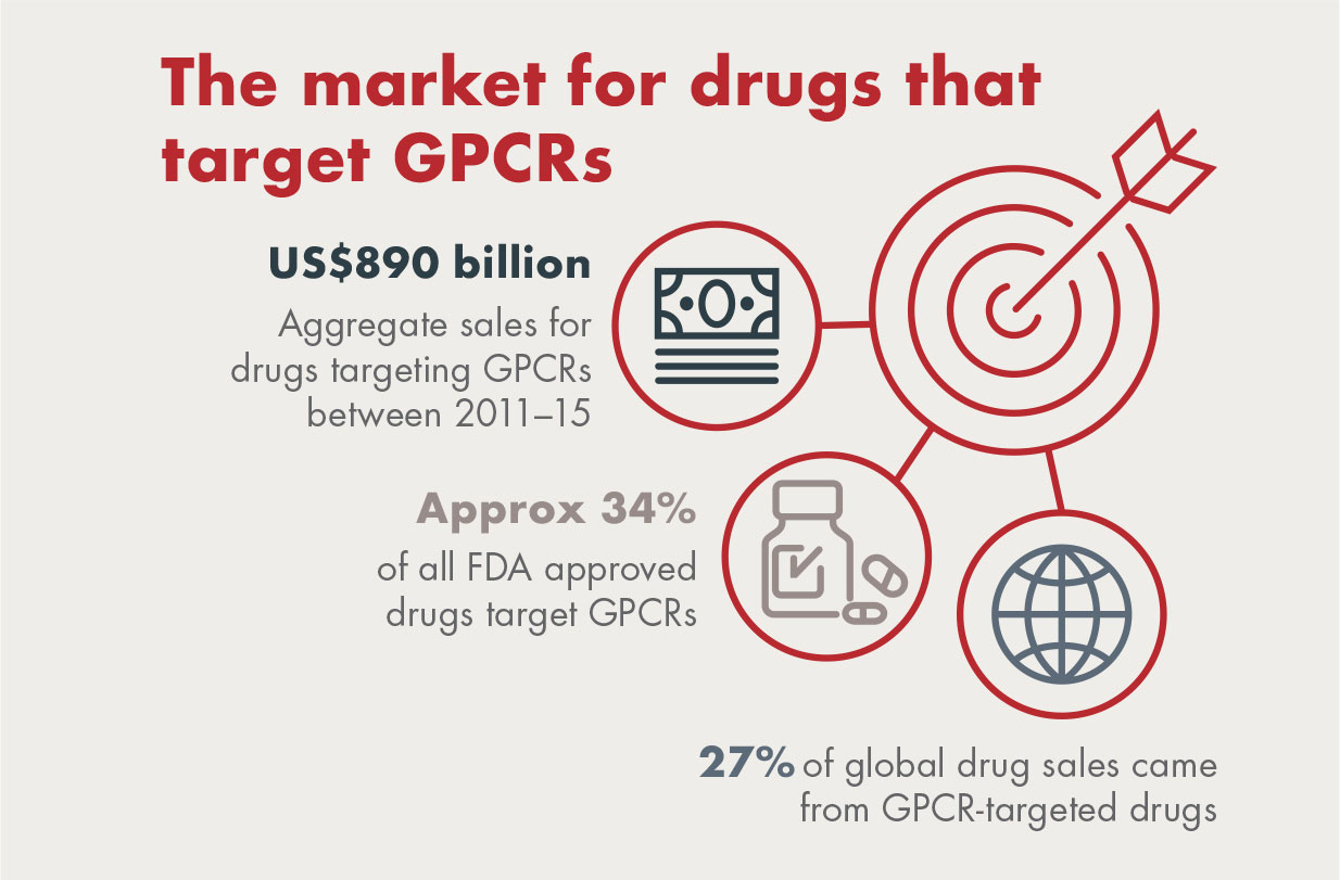 GPCRs are involved in a wide array of diseases including diabetes and obesity and are the most heavily investigated class of drug targets. 25% of the top 200 selling pharmaceuticals target a GPCR, with a total market of $82 billion in 2016. Despite a significant market size, over 80% of GPCR targets are yet to be effectively exploited, due to the inability to identify specific binders that treat patients without unwanted side effects.