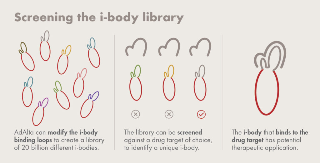 AdAlta has utilised the unique structure of the i-body to develop a proprietary library containing over 20 billion i-body compounds. The library can be rapidly screened against a disease target of choice, to identify i-bodies specific for a range of therapeutically-relevant targets, and develop treatments for many conditions.
